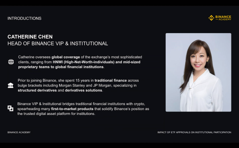 캐서린 첸 바이낸스 글로벌 VIP 및 기관 고객 헤드는 앞서 27일 비대면으로 열린 ‘월간 바이낸스 라운드테이블’에서 가상자산 ETF 승인이 기관 투자자들의 참여에 미치는 영향에 대해 발표했다.