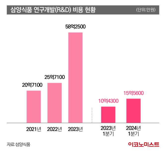 김 부회장은 곧바로 움직였다. 마케팅 부서, 연구소 직원들과 전국의 유명한 불닭·불곱창·닭발 맛집을 직접 탐방하며 시식했다. 세계 여러 국가의 다양한 고추(청양고추·하바네로고추·베트남고추·졸로키아 등)를 연구하며 한국식 ‘맛있게 매운 소스’ 개발에 몰두했다. 김 부회장이 연구개발(R&D)에 쏟은 시간은 약 1년이다. 이 기간 매운 소스 2톤, 닭 1200마리가 소모됐다. 그렇게 2012년 4월 불닭볶음면이 세상에 나왔다. 결과는 ‘성공적’이었다. 불닭볶음면은 출시 1년 만에 월 30억원대 매출을 기록했다.
