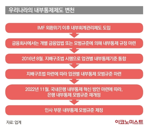 그렇다면 우리나라 금융사들의 내부통제는 어떻게 적용돼 왔을까. 우리나라의 경우 IMF 외환위기 이후 금융회사에 대한 내부통제기능 도입 필요성이 강조돼 왔다. 그 일환으로 2000년대 초반 은행법·증권거래법·보험업법 등 금융규제법에 내부통제기준과 준법감시인 등의 내부통제제도가 도입됐다.