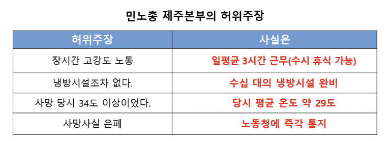 CLS는 “유가족의 슬픔은 철저히 외면한 채 고인의 안타까운 죽음을 정치적으로 악용하고 있는 민노총 제주본부의 행태에 강한 유감을 표한다”면서 “허위사실 유포에 대해 철저한 법적 책임을 물을 예정”이라고 밝혔다.