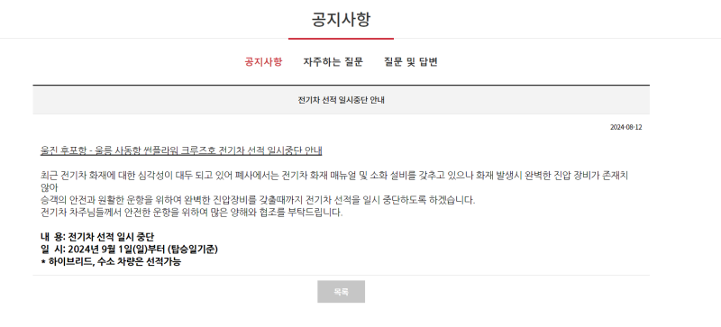 울진 후포항~울릉 사동항을 운항하는 에이치해운 울릉썬플라워크루즈호는 안전사고 예방을 위해 전기차 선적 일시 중단한다. 에이치해운에 따르면 전기차는 선적이 되지 않지만, 하이브리드, 수소 차량은 선적이 가능하다.