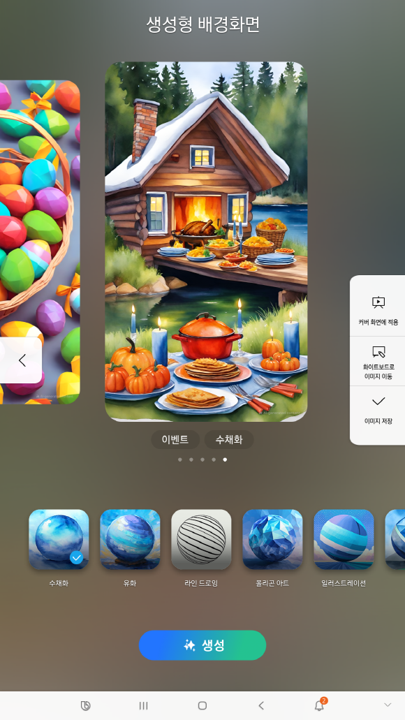 비스포크 AI 패밀리허브 냉장고는 이달 말부터 스마트 포워드 업데이트로 ‘생성형 배경 화면’(Generative Wallpaper)을 적용할 수 있는 신규 기능을 제공한다. 사용자가 자연·꽃·이벤트·음식 등 7가지 테마와 수채화·유화·일러스트 등 6가지 아트 스타일 중 원하는 항목을 선택하면, 맞춤형 이미지를 생성해 준다.