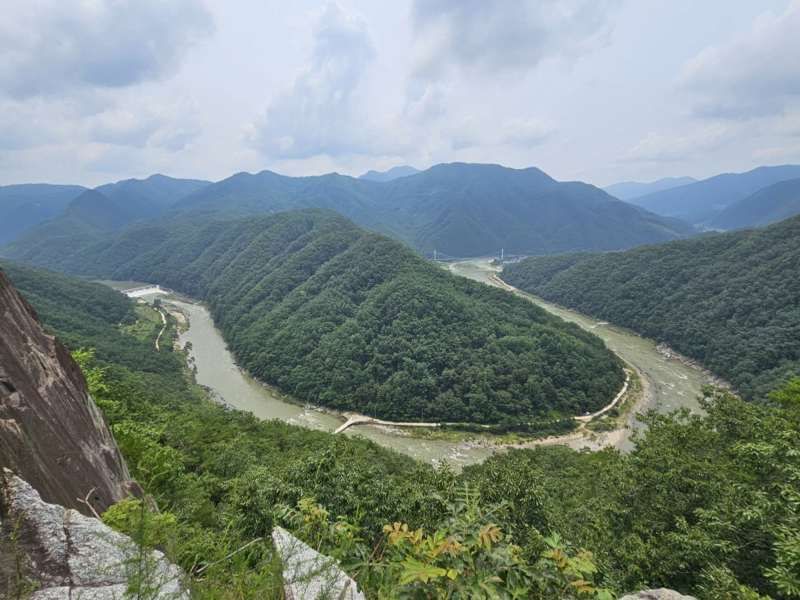 35번 국도를 따라 조금 더 올라가다보면 ‘삼동재 호랑이상 경관 쉼터’라는 팻말이 보인다. 봉화에서 낙동강 줄기를 가장 잘 굽어 볼 수 있는 범바위 전망대다. 범바위라는 지명은 고종 때 선비 강영달이 선조 묘소를 바라보며 절을 하다 만난 호랑이를 맨손으로 잡았다는 얘기에서 유래한다. 그래서 전망대 옆 바위 위에는 호랑이 조형물이 세워져 있다. 전망대에서는 낙동강이 만든 물돌이 모습과 그 중심으로 태극 문양을 하며 돌아치는 아름다운 풍경을 조망할 수 있다. 맑은 하늘 아래 눈앞에 펼쳐진 탁 트인 경치를 배경 삼아 사진을 남기기에 좋다.