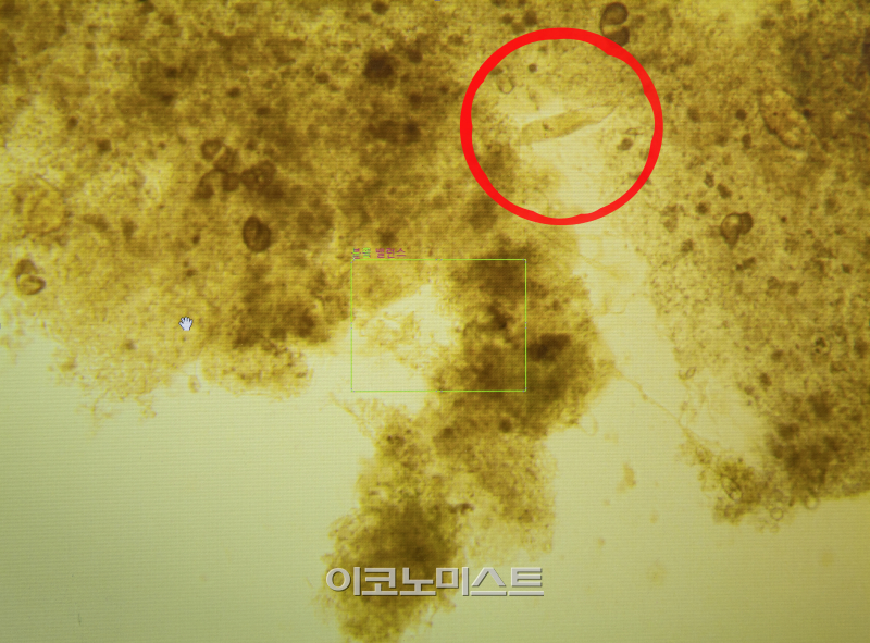 류옥환 환경 명장(젠스 생산본부장)이 폐수 속의 유기물을 분해하는 원생생물의 상태를 현미경으로 살피고 있다. 모니터에 현미경으로 본 화면이 나오고 있다. 붉은 색 원 안에 길게 보이는 것이 원생동물이다. [사진 신인섭 기자]“후배들, 환경 명장 되려면 실적 갖춰야”