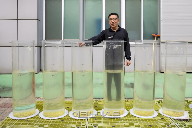 류옥환 환경 명장(젠스 생산본부장)이 서울 송파 석촌호수의 물을 각기 다른 정화 방식으로 처리한 뒤 상태를 관찰하고 있다. [사진 신인섭 기자]
