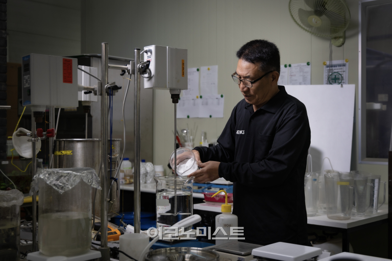 류옥환 환경 명장(젠스 생산본부장)이 폐수 정화를 위한 실험을 하고 있다. [사진 신인섭 기자]