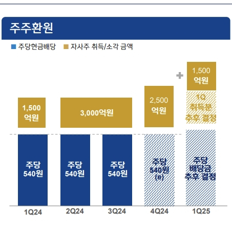 한편, 이날 신한금융지주 이사회는 3분기 주당 배당금 540원과 함께 총 4000억원 규모의 자사주 취득·소각을 결의했다. 이번 자사주 취득·소각 한도 중 2500억원은 2024년 말까지, 나머지 1500억원은 2025년 초에 취득할 예정이다. 이를 통해 2023년 1분기부터 시작한 분기 균등 배당 정책과 함께 2025년도부터는 연중 공백기 없는 자사주 정책을 추진할 계획이다.