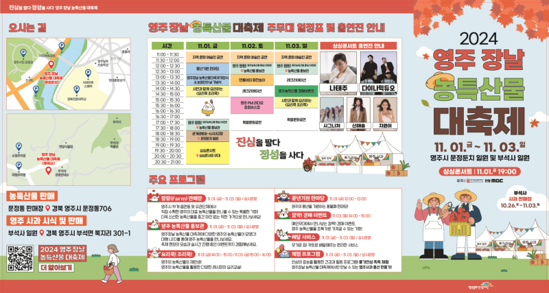 박남서 영주시장은 "영주의 대표 농특산물을 직접 보고 구매할 수 있는 특별한 기회"라며, "단풍이 절경을 이룬 소백산과 부석사의 정취를 만끽하며 축제장을 찾아 영주 농특산물의 매력을 경험해 보길 바란다"고 전했다.