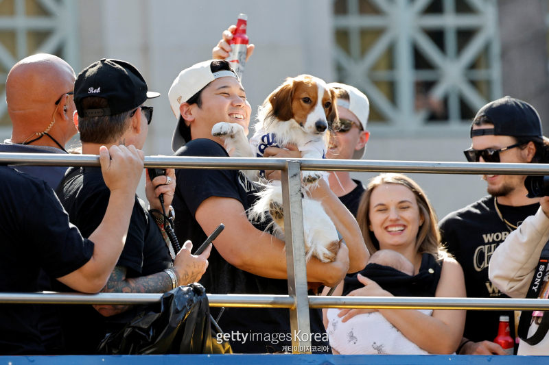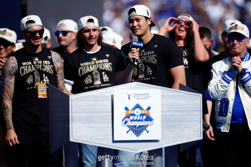 이날 오타니는 아내 마이코 다나카, 애견 데코핀과 함께 메이저리그(MLB) 진출 뒤 처음 경험한 우승을 만끽했다. 동료들과 팬들의 함성 속에 마이크를 잡은 오타니는 평소와 달리 일본어가 아닌 영어로 소감을 말해 눈길을 끌기도 했다. 오타니는 "행복한 순간이다. 이 팀(다저스) 일원으로 여기 있는 게 영광이다. 축하한다. 로스앤젤레스. 정말 감사하다"라고 전했다. 오타니의 영어 인터뷰에 다저 스타디움을 메운 LA팬들이 다시 열광했다.
