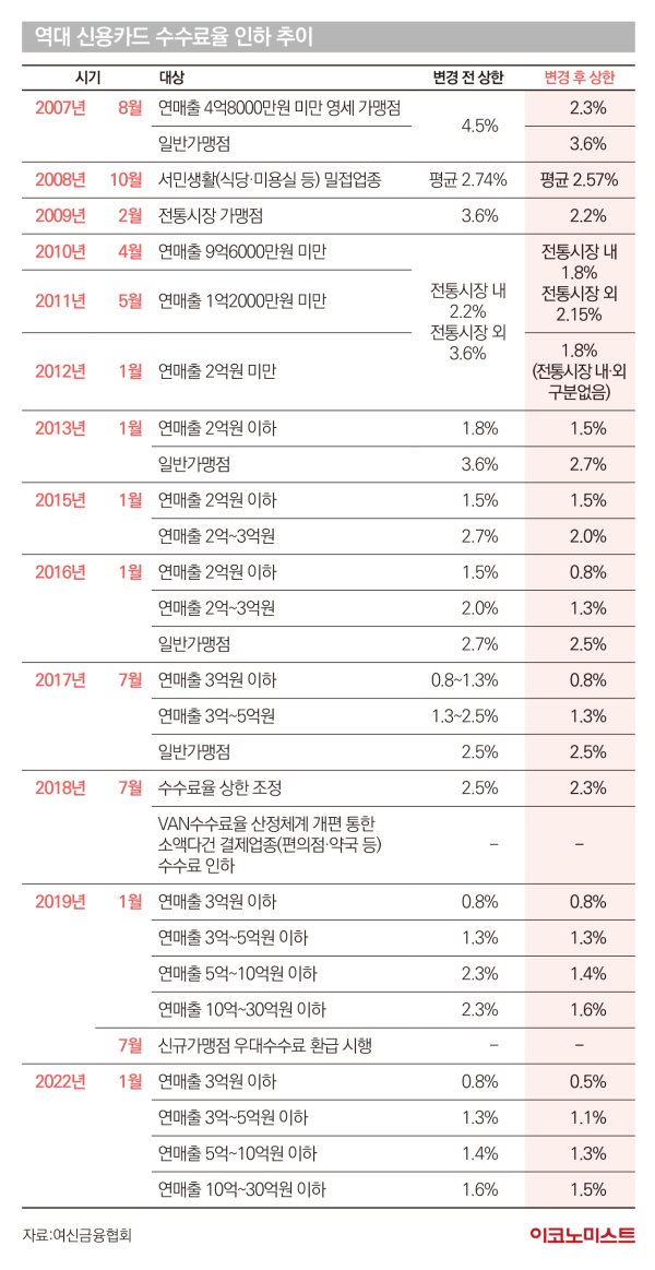 제도 도입 이래 4차례 수수료 조정으로 연 매출 3억원 이하 영세 가맹점의 수수료는 2.3%에서 0.5%로 인하됐다. 연 매출 3억원 이상 30억원 미만 소규모 가맹점의 경우 3.6%에서 1.1~1.5%로 낮아졌다.