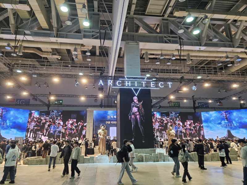 제2전시관에는 하이브IM의 신작 ‘아키텍트:랜드 오브 엑자일’ 관람객들의 이목을 끌었다. 아키텍트는 언리얼 엔진5 기술을 활용한 실사풍 그래픽과 현존 최고 기술력이 집약된 하이엔드 AAA급 MMORPG다. 방대한 심리스 월드로 구현된 필드에서 펼쳐지는 개성 넘치는 보스, 몬스터들과의 박진감 넘치는 전투는 물론, ▲비행 ▲수영 ▲암벽 등반 등 제약 없는 특수 이동을 통해 세계 곳곳을 자유롭게 모험하는 즐거움을 만끽할 수 있는 것이 특징이다.