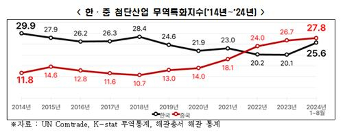 28일 한국경제인협회가 2014년부터 올해(1∼8월)까지 양국의 첨단산업 무역특화지수(TSI)를 분석한 결과에 따르면 한국은 2022년 TSI 20.2를 기록해 중국(24.0)에 처음 역전당했으며 2023년은 TSI가 20.1로 하락해 중국(26.7)과 격차가 더 벌어졌다.