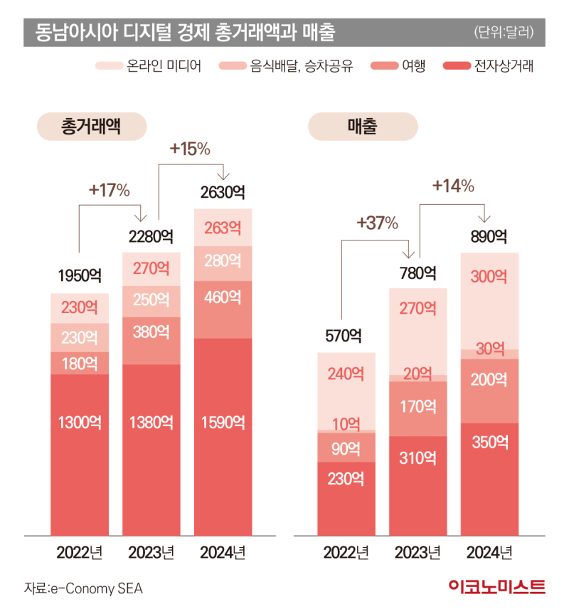 동남아시아 디지털 경제에서 가장 눈에 띄는 변화는 지속가능한 성장을 위해 그동안 성장성에 치우친 것에서 벗어나 수익성을 강화하기 시작한 것이다. 2022년 40억달러(약 5조6000억원)였던 수익은 2023년 90억달러(12조6000억원)가 되었고 2024년에는 110억 달러(15조4000억원)에 달해 2년내 무려 2.5배가 증가할 전망이다.