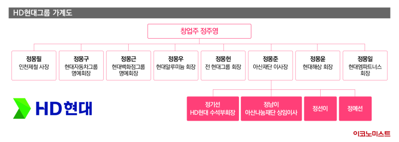그룹 지주사인 HD현대의 최대주주는 정몽준 이사장으로 26.6%의 지분을 소유하고 있다. 정 수석부회장은 6.12%의 지분을 가지고 있는 2대 주주다.