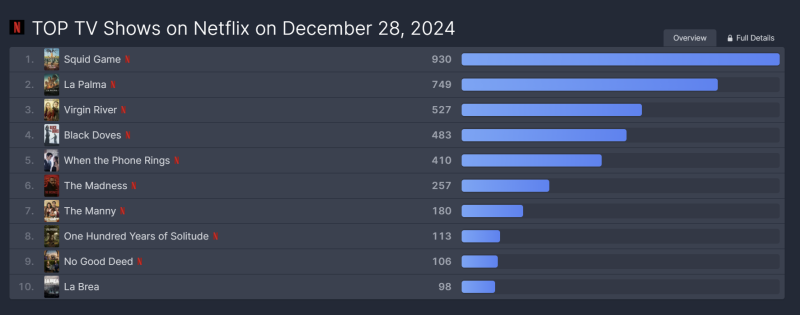 29일 OTT 플랫폼 콘텐츠 시청 순위 집계 사이트인 플릭스패트롤에 따르면 '오징어 게임' 시즌 2는 전날 기준 넷플릭스 TV 프로그램 부문 전 세계 톱 10 중 1위에 이름을 올렸다.