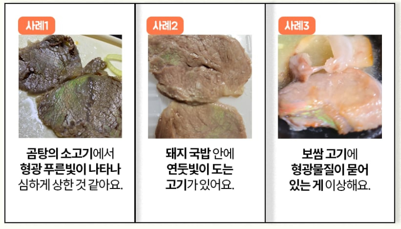 구체적으로는 “곰탕의 소고기에서 형광 푸른빛이 나타난다. 심하게 상한 것 같다”라거나 “보쌈 고기에 형광물질이 묻어있는 게 이상하다” 등의 내용이었다.