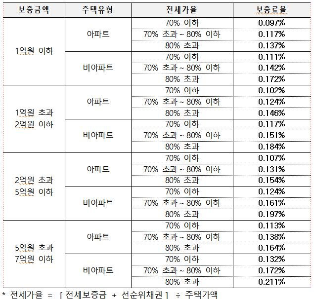 HUG는 아울러 9000만원 이하, 9000만원 초과 ∼ 2억원 이하, 2억원 초과로 나뉘던 전세 보증금 분류도 ▲1억원 이하 ▲1억원 초과∼2억원 이하 ▲2억원 초과∼5억원 이하 ▲5억원 초과∼7억원 이하의 4단계로 세분화했다.