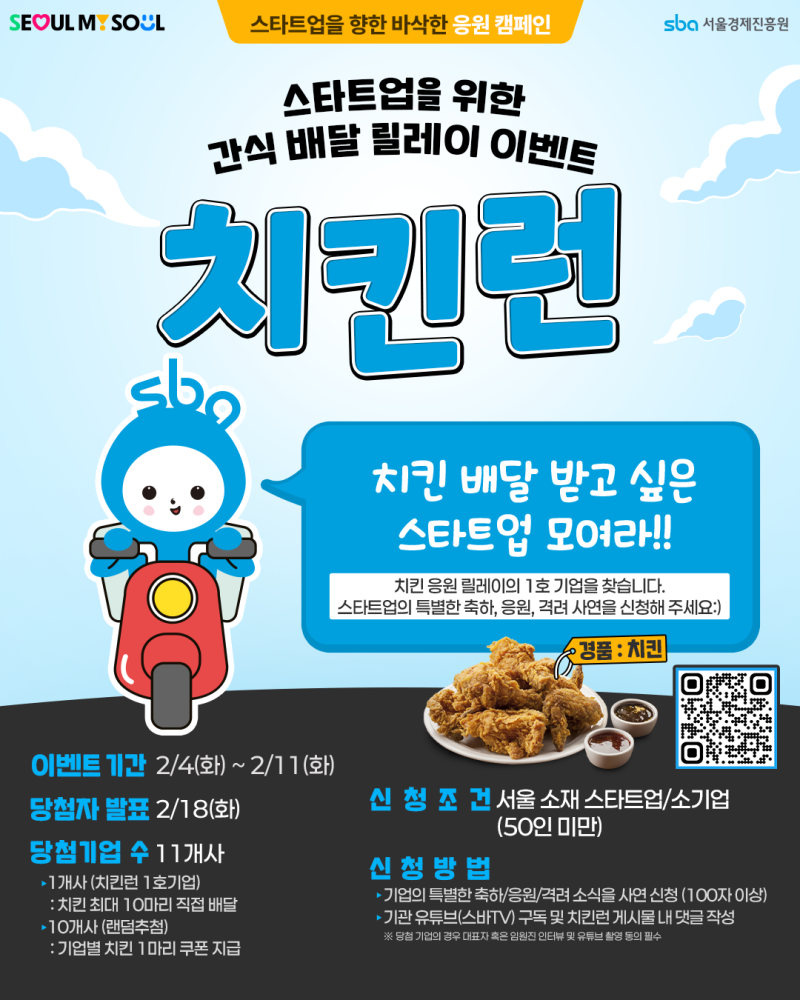 서울시의 경쟁력을 만드는 중소기업 지원기관 서울경제진흥원은 서울 스타트업을 응원하고 격려하는 문화를 조성하기 위한 간식 릴레이 캠페인 ‘치킨런’ 챌린지를 2월 중순부터 추진할 예정이라고 밝혔다.