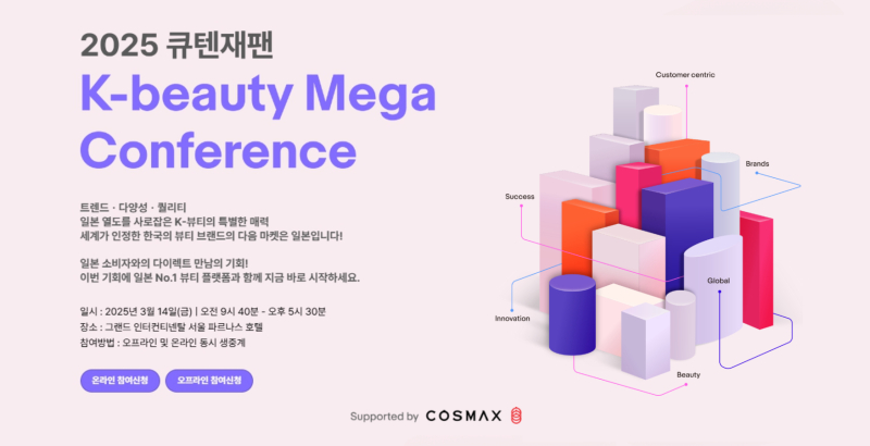 컨퍼런스는 3월 14일 오전 9시 40분부터 오후 5시 30분까지 진행된다. 온라인으로도 참여할 수 있으며, ‘큐텐재팬 K뷰티 메가 컨퍼런스(Mega Conference)’ 홈페이지에서 신청하면 된다.