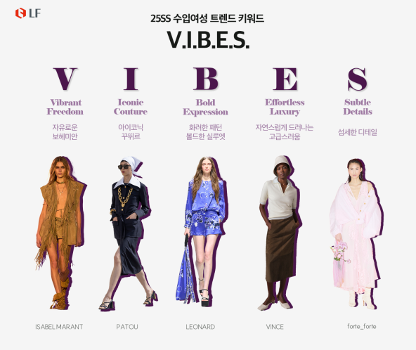 해당 트렌드는 LF가 현재 전개 중인 수입 브랜드 ▲이자벨마랑(ISABEL MARANT) ▲빠투(PATOU) ▲빈스(VINCE) ▲레오나드(LEONARD) ▲포르테포르테(forte_forte) 등의 2025 SS 컬렉션 및 제품 출시 동향을 분석해 제시한 것이다.