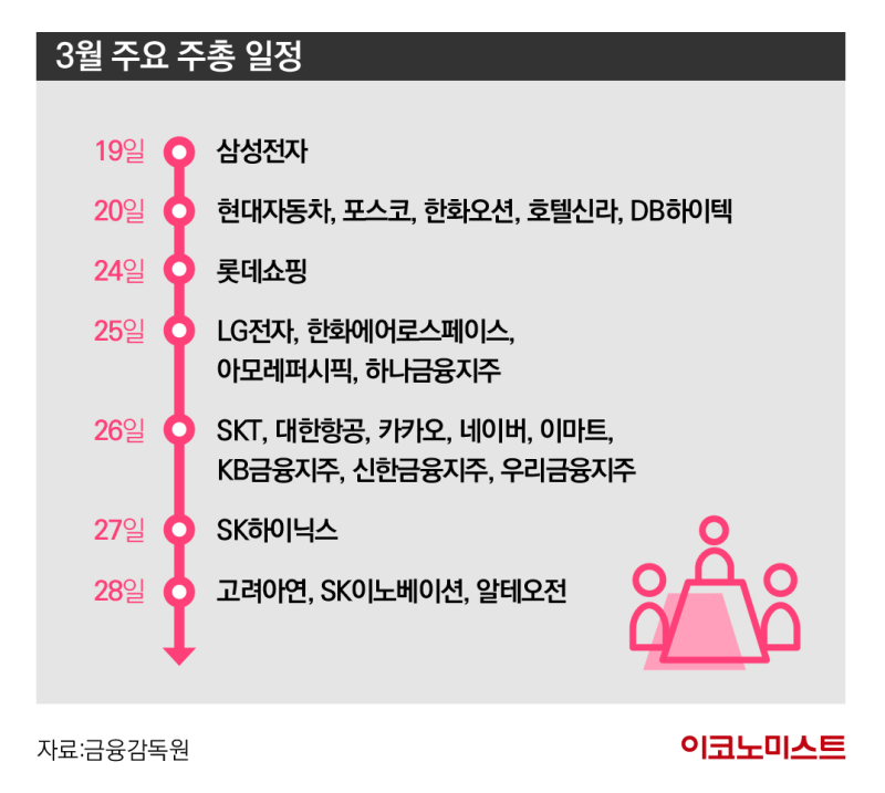 실제 3월 19일 삼성전자와 20일 현대차·포스코홀딩스를 시작으로 주요 대기업의 주총이 3월 중하순에 연달아 진행된다. 특히 24일 시작하는 3월 넷 째주는 굵직한 기업의 주총이 대거 몰린 ‘수퍼 주총 위크’로 통한다. 24일 롯데쇼핑, 25일 LG전자·한화에어로스페이스·아모레퍼시픽·하나금융지주, 26일 SK텔레콤·대한항공·카카오·네이버·이마트, 27일에는 SK하이닉스, 28일에는 고려아연·SK이노베이션·알테오전이 주총을 연다.