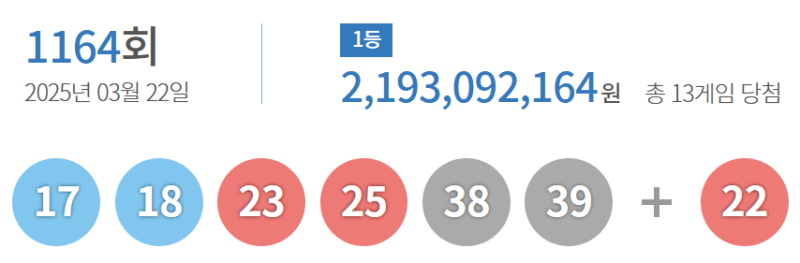 1164회 로또 1등 당첨번호 ‘17‧18‧23‧25‧38‧39’…보너스 ‘22’