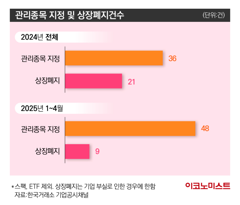 이 같은 변화는 통계에서도 확인할 수 있다. 한국거래소 상장공시시스템(KIND)에 따르면 올해 1~4월 동안 스팩(기업인수목적회사)과 상장지수펀드(ETF)를 제외한 일반 상장기업 중 관리종목으로 지정된 곳은 총 48곳으로, 지난해 전체 건수(36건)를 이미 넘어섰다.