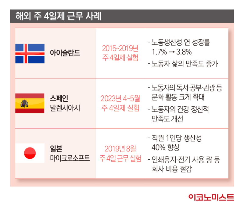 [이코노미스트 김윤주 기자] 주 4일제 실험은 이미 세계 곳곳에서 긍정적인 성과를 내고 있다. 아이슬란드는 생산성과 만족도를 동시에 끌어올렸고, 영국은 기업과 근로자가 함께 제도의 지속을 원했다. 스페인과 일본 역시 근로자의 건강 개선, 기업의 비용 절감 등 다양한 효과를 확인했다. 이와 같은 해외 사례는 한국에서 검토 중인 주 4.5일제의 구체적인 방향을 모색할 수 있는 기회다.