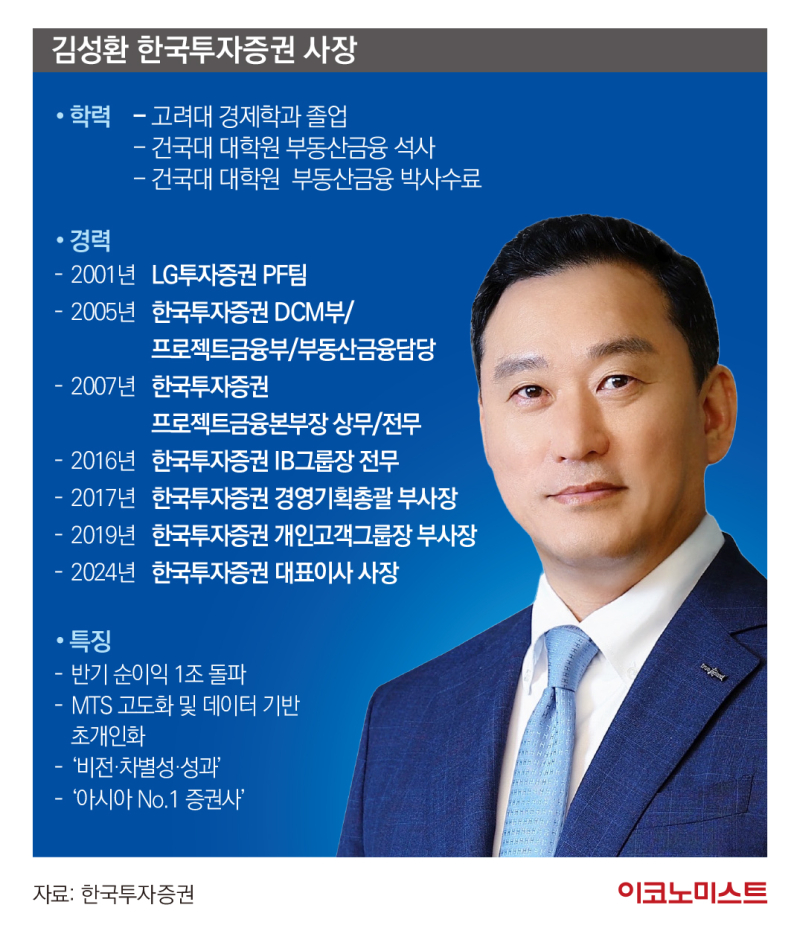 [이코노미스트 송현주 기자] 한국투자증권이 2025년 상반기 사상 최대 실적을 올리며 업계 최정상 자리를 굳혔다. 그 배경에는 2024년 1월 취임한 김성환 사장의 뚜렷한 경영철학과 전략적 리더십이 자리한다. LG투자증권을 거쳐 2005년 한국투자증권에 합류한 그는 기업금융(IB)·경영기획·리테일 등 증권사가 수행하는 전 영역을 두루 경험하며 전문성과 실무 능력을 쌓아왔다. 이러한 이력은 취임 이후 공격적인 시장 개척과 안정적 성장이라는 두 마리 토끼를 잡는 데 큰 힘이 됐다.