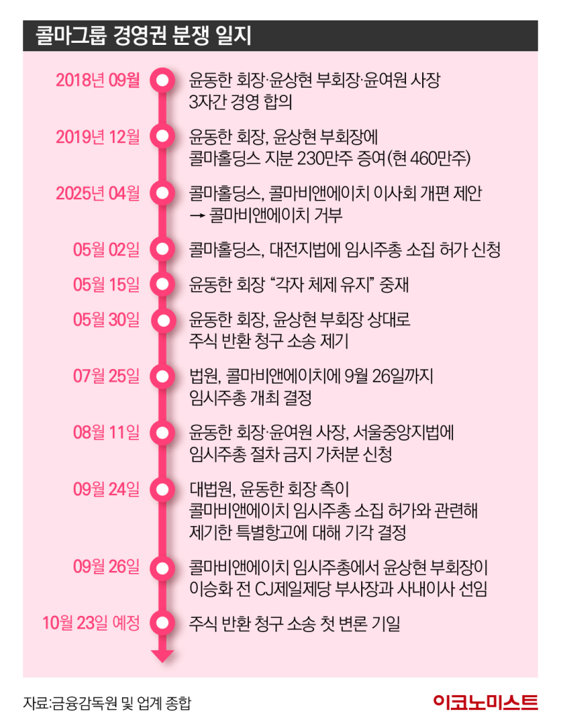 [이코노미스트 이승훈 기자] 콜마그룹 경영권 분쟁이 장기전 국면으로 접어들고 있다. 창업주 윤동한 회장의 장남 윤상현 콜마홀딩스 부회장과 장녀 윤여원 콜마비앤에이치(BNH) 대표 간의 갈등은 단순한 가족 간 분쟁을 넘어 지배구조와 승계 원칙, 나아가 국내 기업 경영권 분쟁의 전례를 남길 수 있는 중대 사건으로 평가된다. 최근 임시주주총회에서 윤상현 부회장 측이 이사회 과반을 확보하면서 경영 주도권을 사실상 장악했지만, 법적 불확실성과 추가 주총 변수가 남아 있어 분쟁의 향방은 여전히 안갯속이다.