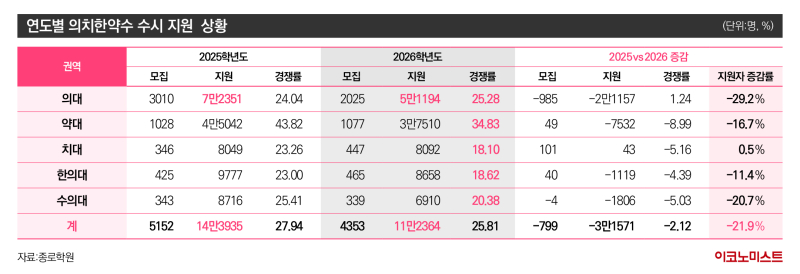의약학계열 지원 열기도 다소 식었다. 전국 의대·치대·한의대·약대·수의대 평균 경쟁률은 25.81대 1로 집계됐다. 의대는 평균 25.28대 1, 치대는 18.10대 1, 한의대 18.62대 1, 약대가 34.83대 1, 수의대 20.38대 1이었다. 지난해 2025학년도 의·치·한·수·약 평균 경쟁률 27.94대 1에 비해 하락했고, 지원자 수도 3만1,571명(21.9%) 줄었다.