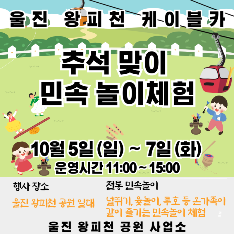 민속체험과 이벤트도 빠지지 않는다. 민속놀이 체험(10월 5~7일), 제기왕 선발대회(10월 6일), 한복 프로모션(추석 당일, 한복 착용 고객 무료 입장) 등이 왕피천공원 일대에서 열린다.
