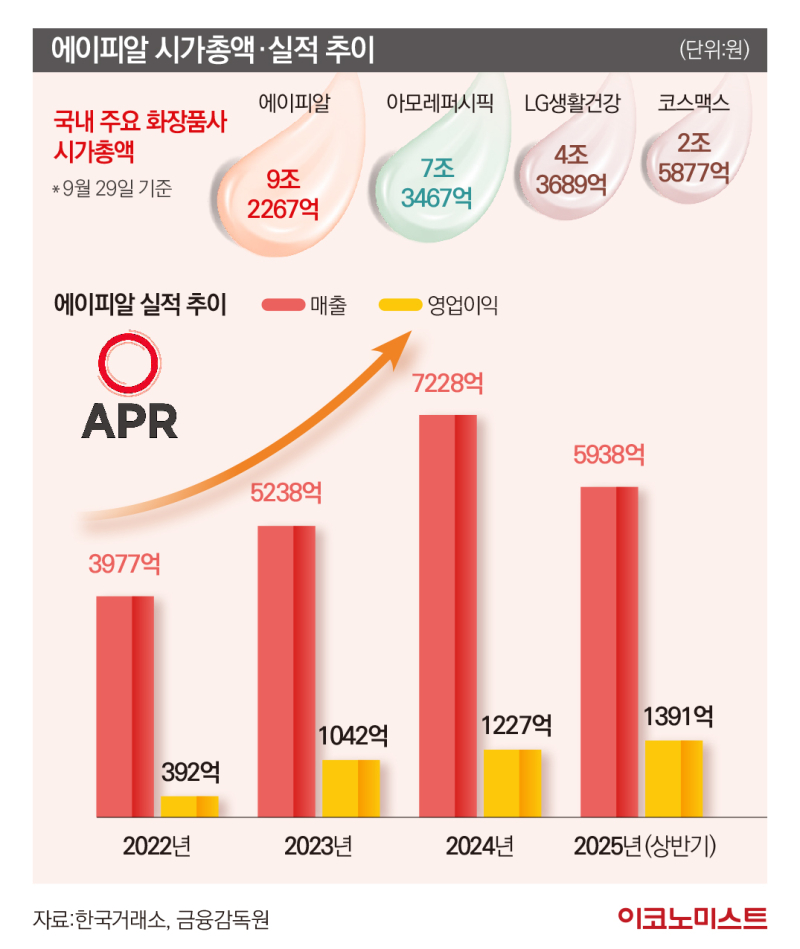 역대급 성적에 주가도 고공 행진 중이다. 지난 8월 6일 2분기 실적을 발표한 뒤 코스피 시장에서 에이피알은 전날보다 11.32% 오른 20만8500원으로 거래를 마쳤다. 시총은 7조9322억원으로 지난 6월 업계 2위 LG생활건강의 시총을 추월한 지 약 두 달 만에 아모레퍼시픽(7조5339억원)을 제치며 화장품 대장주로 올라섰다.