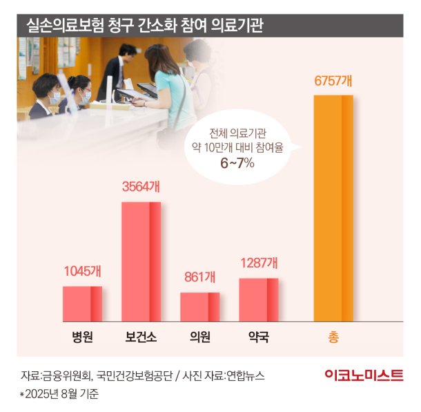 금융위원회에 따르면 지난 8월 기준 실손 간소화에 참여 중인 의료기관은 총 6757개다.(병원 1045개·보건소 3564개·의원 861개·약국 1287개) 금융위는 참여기관 개수 기준 1단계 참여율이 59.1%라고 밝혔다.