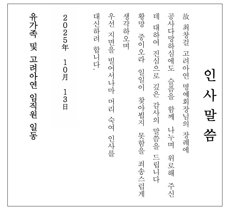 장례 절차를 마친 고려아연 임직원 일동은 13일 “공사다망하심에도 슬픔을 함께 나누며 위로해주신데 대해 진심으로 깊은 감사의 말씀을 드린다”고 감사 인사를 전했다.