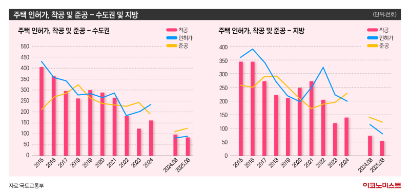 현재 주택가격 불안의 뇌관이 되고 있는 신규 주택공급의 경우 2023년부터 전국적으로 착공이 크게 감소했다. 주택 건설 기간인 3년 정도의 시차를 두고 준공 물량도 2026년부터 크게 축소될 전망이다. 2023~2024년 평균 연간 주택 착공 물량은 전국 27만5000호, 수도권 14만5000호로 각각 과거 10년 평균 대비 55% 수준에 머물고 있다.