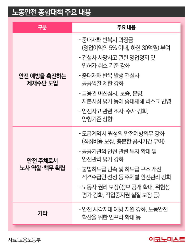 또한 지난 9월 15일 발표된 노동안전 종합대책은 ▲과징금 부과 ▲영업정지 ▲대출 제한 등 건설산업 전반에 중대한 영향을 미칠 수 있는 방안들을 포함하고 있으며, 사망사고가 잇따르고 있는 건설사들의 공정 관리와 하도급 구조 전반에 근본적인 변화를 요구하고 있다.