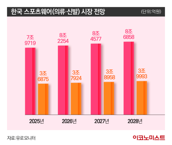 당분간 패션업계의 러닝 시장 공략은 계속될 것으로 보인다. 글로벌 시장조사기관 유로모니터가 예상한 올해 국내 스포츠웨어(러닝 의류·신발 등 포함) 시장 규모는 11조6593억원이다. 이는 전년 동기(11조3043억원) 대비 3% 증가한 수치다. 유로모니터는 지난 3년(2022~2024년)간 꾸준히 성장해 온 국내 스포츠웨어 시장이 오는 2028년까지 오름세를 이어가 12조6851억원 규모에 도달할 것으로 예상했다.