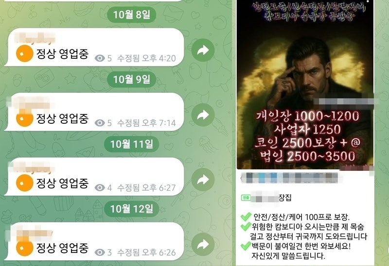 또 다른 모집책은 “7일에서 15일 사이 항공 VIP 서비스, 호텔 독실, 노래방·사우나 등 편의시설을 제공하며 휴대전화도 사용 가능하다”며 고수익을 미끼로 ‘장’(통장 명의자)을 모집했다. 일부는 ‘정상 영업 중’이라는 문구를 내걸며 단속에도 굴하지 않는 모습을 보였다.