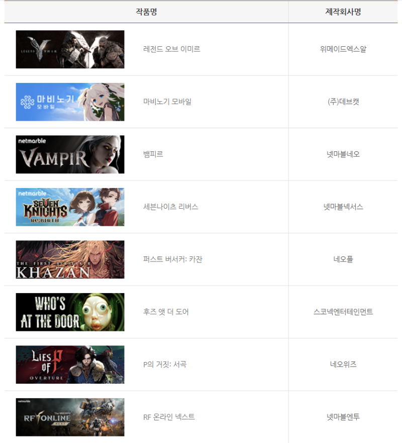 부문별 후보작을 살펴보면, 대통령상 및 국무총리상이 포함된 본상에는 ‘레전드 오브 이미르’, ‘마비노기 모바일’, ‘뱀피르’, ‘세븐나이츠 리버스’, ‘퍼스트 버서커: 카잔’, ‘후즈 앳 더 도어’, ‘P의 거짓: 서곡’, ‘RF 온라인 넥스트’가 이름을 올렸다.