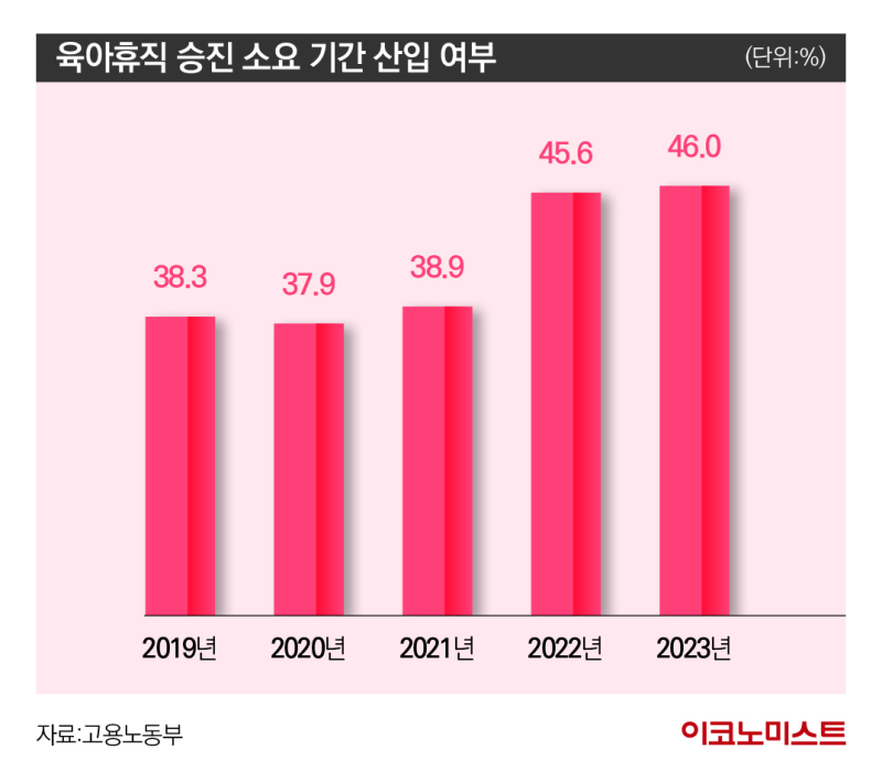 이런 노력도 육아휴직 기간을 근속 연수로 인정하지 않는 승진 제도로 인해 희석되는 분위기다. 고용노동부의 실태 조사 결과 육아휴직 기간을 승진 소요 기간에 산입하지 않는 사업체의 비중은 2021년 38.9%에서 2023년 46.0%로 증가세를 띄었다.