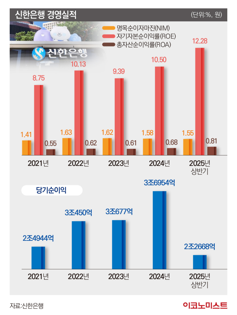 신한은행은 올해 상반기 금리 인하 기조와 가계대출 규제 등 불리한 환경 속에서도 견조한 실적을 유지했다는 평가를 받는다. 금리 하락기에도 마진 방어에 성공하며 이자이익을 지켰고, 수수료이익과 유가증권 관련 이익이 늘어나 전체 실적을 견인했다. 이에 따라 은행의 수익성 지표인 순이자마진(NIM)은 상반기 말 기준 1.55%를 유지했다.