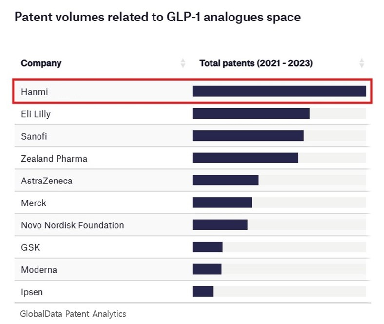 글로벌 데이터 분석 기업(GlobalData Plc)이 제공하는 특허 분석 자료에 따르면, 한미그룹은 2021~2023년 비만 및 대사 GLP-1 계열 분야 특허 수에서 1위를 차지하며, GLP-1 유사체 관련 특허 기술에서 업계를 선도하고 있음이 확인됐다. 이 같은 지식재산권 경쟁력은 한미약품이 글로벌 비만 치료제 시장에서 지속적으로 차별화된 가치를 창출할 수 있는 강력한 기반이 되고 있다.