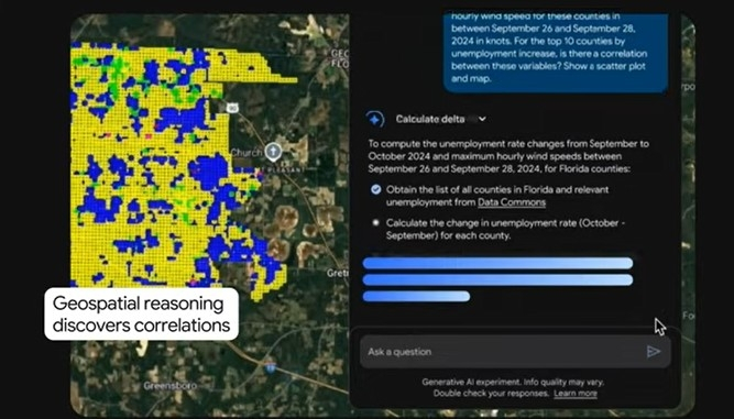 '구글 어스 AI'는 제미나이를 기반으로 날씨 예보와 인구 밀도 지도, 위성 이미지 등 지금까지 분리돼 있던 여러 '어스 AI' 모델을 AI가 자동으로 연결해 이용자의 복잡한 질문에 답한다.