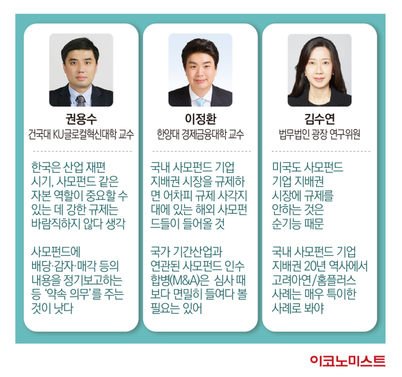 권용수 건국대 KU글로컬혁신대학 교수는 "현재 한국의 경우 산업 재편이 필요한 시기인데 이럴 때는 사모펀드와 같은 자본의 역할이 필요할 수 있다"면서 "강하게 규제하는 것은 바람직하지 않은 것 같다"고 했다.