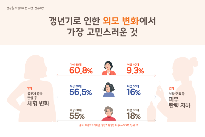 특히 갱년기 여성의 가장 큰 고민은 체형 변화였다. 트렌드코리아팀이 갱년기 유경험 여성 900명을 조사한 결과, 40대 (60.8%), 50대(56.5%), 60대(55%) 여성 모두 연령층에서 ‘몸무게 증가나 뱃살 등 체형 변화’를 1순위 고민으로 꼽았다. 이어 ‘피부 탄력 저하’는 40대 9.3%, 50대 16%, 60대 18%로 나타나 연령이 높을수록 피부 노화에 대한 인식이 커지는 경향을 보였다.