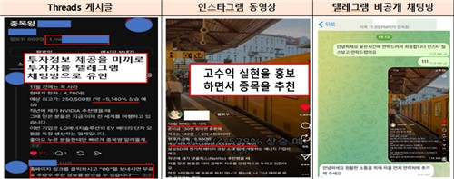 금감원에 따르면 피해자들은 스레드, 인스타그램 등 SNS에서 고수익 해외주식 종목을 추천해준다는 게시글에 함께 적힌 텔레그램 연결 링크로 불법 리딩방에 입장하는 경우가 많았다.