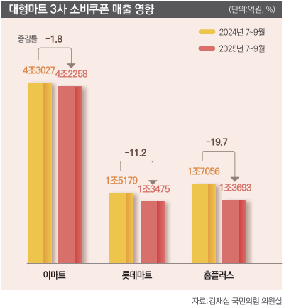 소비쿠폰 사용처에서 제외된 대형마트들은 직접적인 매출 타격을 받았다. 김재섭 국민의힘 의원실에 따르면 홈플러스의 올해 3분기 매출은 1조3693억원으로 지난해 같은 기간과 비교해 19.7% 줄었다. 같은 기간 롯데마트의 매출은 11.2% 감소한 1조3475억원을, 이마트는 1.8% 줄어든 4조2258억원의 매출을 각각 기록했다.