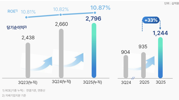 3분기 순이익은 1조2444억원으로 전년 동기 대비 37.6% 증가했다. 자산 리밸런싱과 조달비용 효율화로 은행 NIM이 전분기 대비 3bp 상승했다. 은행 WM·카드·캐피탈 부문 영업력 강화와 보험 손익 반영으로 비이자이익도 전분기 대비 5.3% 늘어나는 등 수익 구조가 다변화됐다.