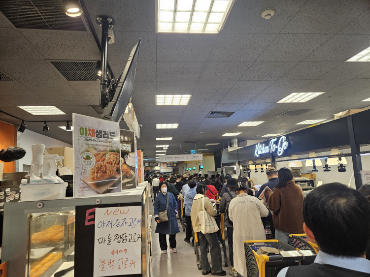 신선식품 판매 공간으로 연결된 매장 입구 앞은 혼잡도가 더욱 심했다. 어림잡아 100여명은 될 정도로 줄이 길었다. 현장에 있던 사람들은 대부분 커다란 장바구니를 하나씩 들고 있었다. 긴 대기줄을 예측한듯 간이의자까지 챙겨온 사람들도 보였다.